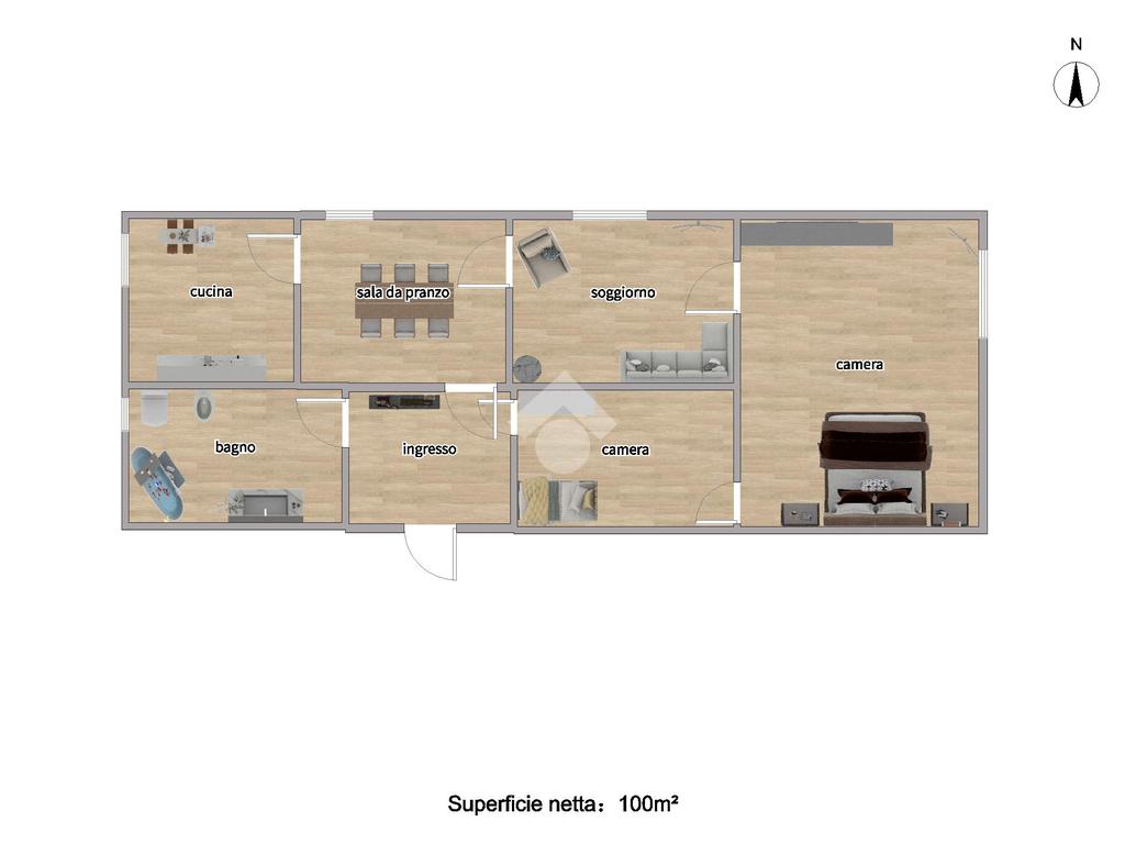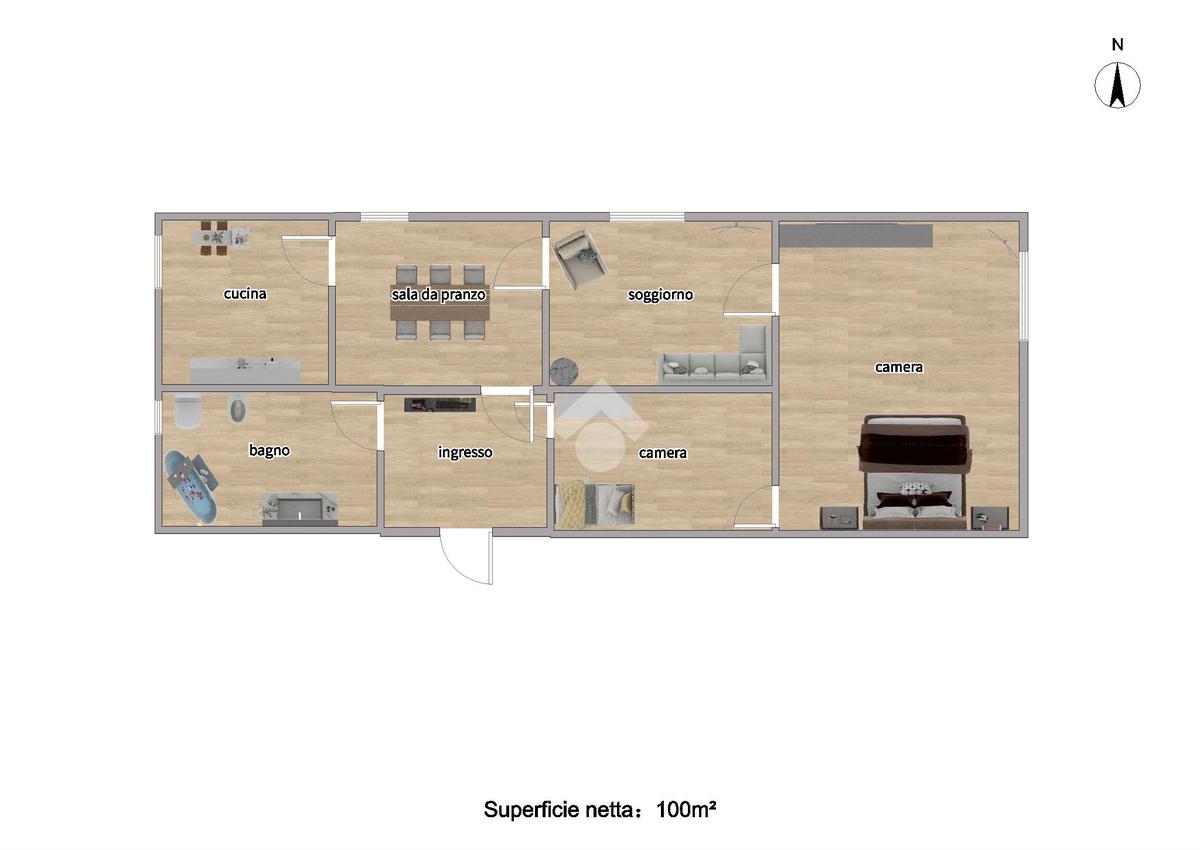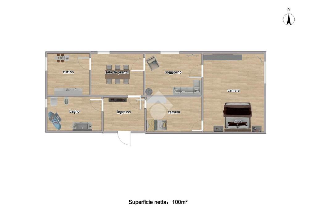 La soluzione si compone di ingresso, cucina, sala da pranzo, soggiorno, camera da letto, cameretta e bagno.